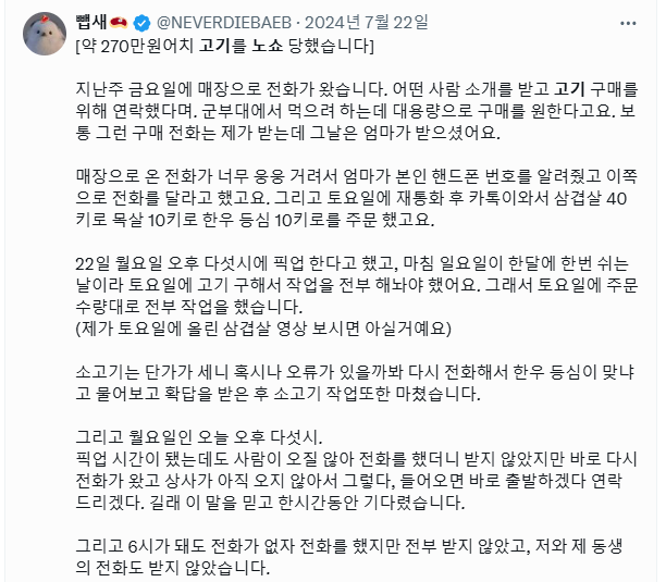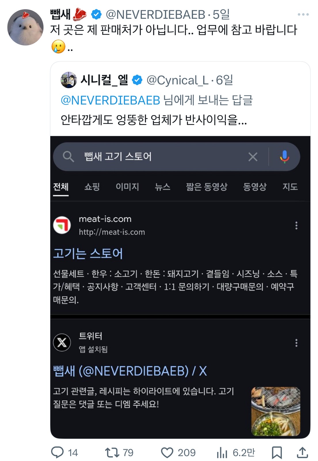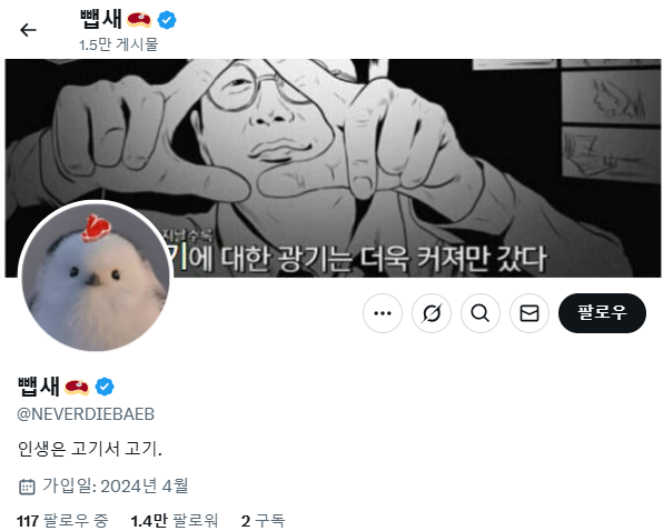 정육업을 하던 평범한(?) 소상인이자 트위터 유저 ‘뺍새(@NEVERDIEBAEB)’는