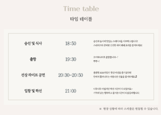 18:50 | 승선 및 식사 시작 |