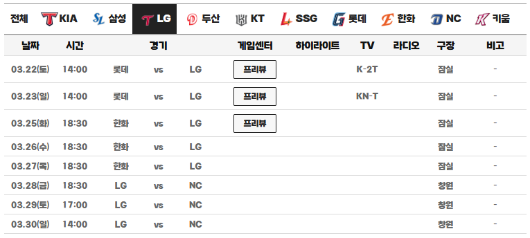 3월 25일 (화) | 18:30 | 한화 vs LG | 대전 | - | 대구 |