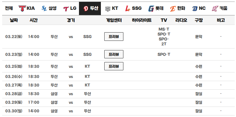 3월 22일 (토) | 14:00 | 두산 vs LG | 잠실 | M-T | 광주 |