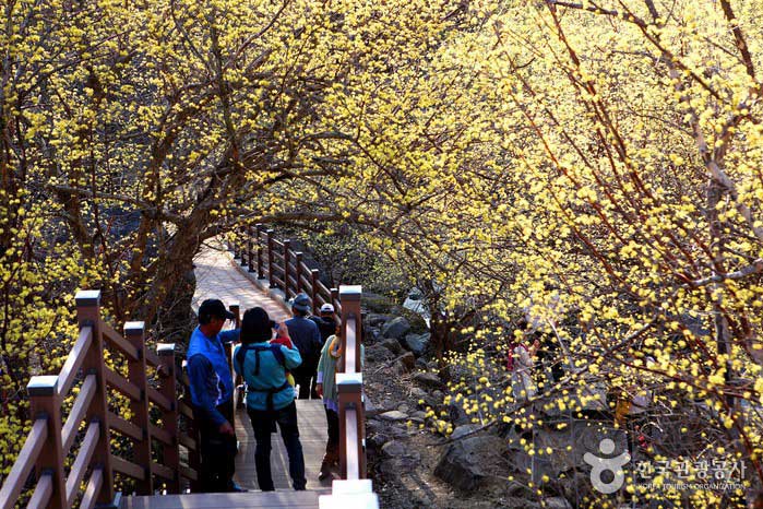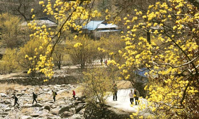 산수유꽃이 흐드러진 길을 따라 걸으며 따스한 봄기운을 온몸으로 느낄 수 있습니다.