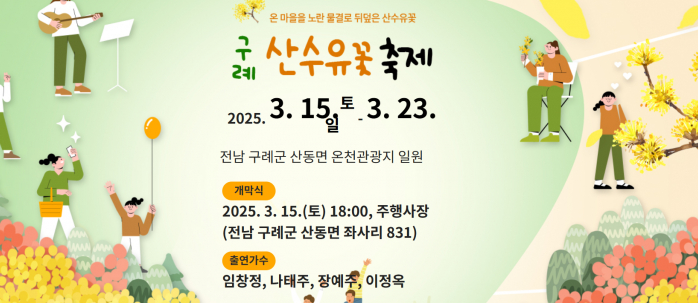 2025년 구례 산수유꽃축제가 3월 15일(토)부터 3월 23일(일)까지 9일간 개최됩니다.