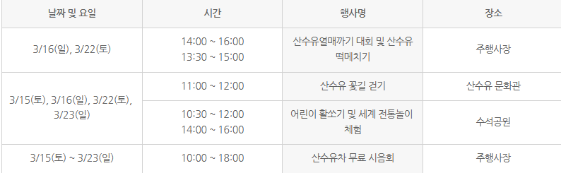 개막 축하 공연부터 산수유꽃길 걷기, 전통 체험, 산수유차 무료 시음회까지