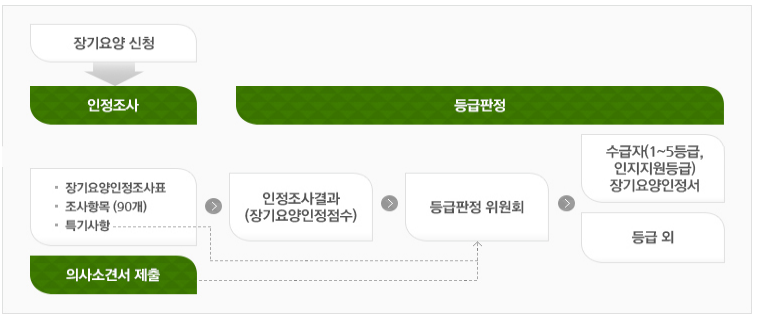 장기요양인정 신청절차 장기요양인정 신청 신청자격 장기요양보험가입자 및 그 피부양자, 의료급여수급권자 65세 이상의 노인 65세 미만으로서 치매, 뇌혈관질환 등 대통령령으로 정한 노인성