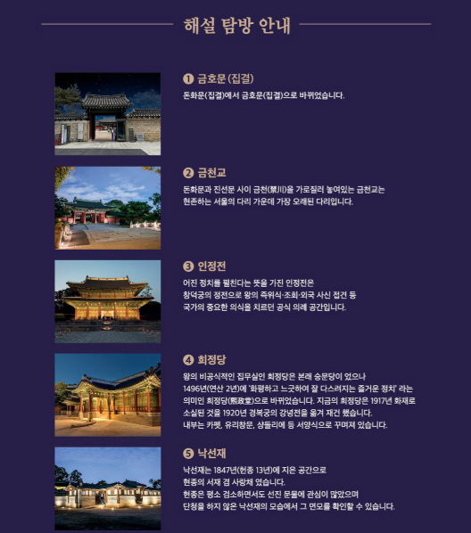 - 관람 구역: 금천교, 인정전, 낙선재, 창덕궁 후원(유네스코 세계문화유산)
