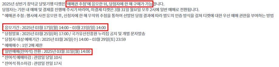 - 잔여석 일반 예매: 2025년 3월 31일(월) 14:00 선착순